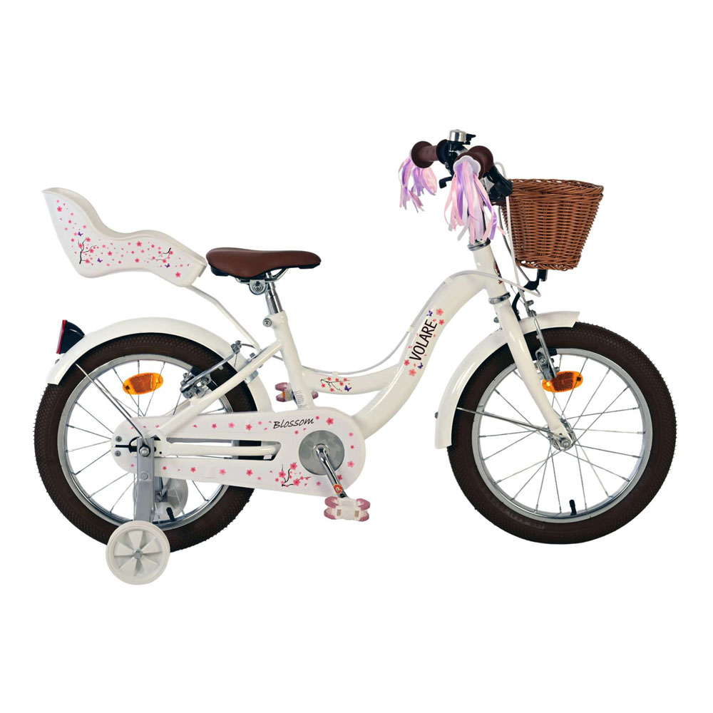 Learning to ride a bike is fun for every child with the Volare Blossom 16-inch children's bike! Safety is paramount! That's why this cool bike doesn't have a coaster brake, but two hand brakes, removable training wheels, and a closed chain guard. The bike has reflectors on the front, back, and wheels. Comfort has also been considered. The beautiful pink Volare bike has a comfortable, soft saddle, a doll seat, cheerful handlebar decorations, and a handy wicker basket. To ensure you can enjoy the bike for as long as possible, the saddle and handlebars are height-adjustable. It comes with all the mounting hardware needed to assemble the bike! In short: a top quality bicycle for a competitive price!