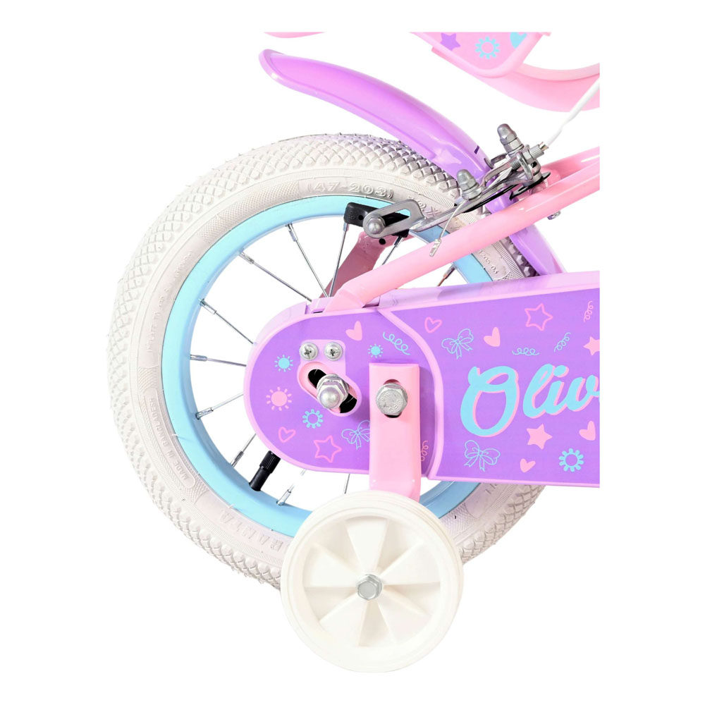 The Volare Olivia 12-inch children's bike is a cute and stylish bike for young girls exploring their first cycling experiences. With its soft pink colour, purple handlebars, saddle, and mudguards, this bike is a real eye-catcher. The bike is equipped with two hand brakes (no coaster brakes), ensuring safe and controlled braking at all times. The enclosed chain guard protects little fingers and keeps the chain clean. Thanks to the reflectors in the wheels, both front and rear, your child is clearly visible on the road. The removable training wheels help children learn to ride a bike step by step, and when they're ready to ride independently, the training wheels are easily removed. A fun doll seat sits on the back of the bike, so their favourite doll can always come along on their adventures. The saddle and handlebars are height-adjustable, so the bike grows with your child. It also features a bell, so everyone knows a proud little cyclist is approaching. The Volare Olivia 12-inch children's bike combines safety, comfort, and a sweet design perfect for every fun-filled and imaginative ride.