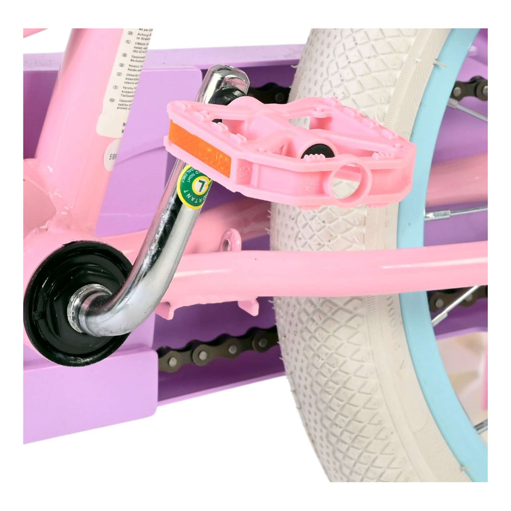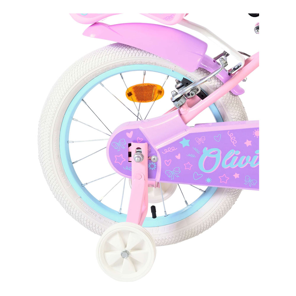 The Volare Olivia 16-inch children's bike is a cute and stylish bike for young girls who want to ride with pride. With its soft pink colour, purple handlebars, saddle, and mudguards, this bike is a real eye-catcher. The bike is equipped with two hand brakes (no coaster brakes), ensuring safe and controlled braking at all times. The enclosed chain guard protects little fingers and keeps the chain clean. Thanks to the reflectors in the wheels, both front and rear, your child is clearly visible on the road. The removable training wheels help children learn to ride a bike step by step, and when they're ready to ride independently, the training wheels are easily removed. A fun doll seat sits on the back of the bike, so their favourite doll can always come along on their adventures. The saddle and handlebars are height-adjustable, so the bike grows with your child. It also features a bell, so everyone knows a proud little cyclist is approaching. The Volare Olivia 16-inch children's bike combines safety, comfort, and a sweet design perfect for every fun-filled and imaginative ride.