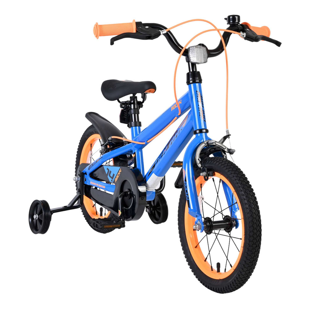 Learning to ride a bike is fun for every child with the Volare Rocky 14-inch children's bike! Safety is paramount! That's why this cool bike has two handbrakes, an enclosed chain guard, and removable training wheels. It also features a fun bell. Comfort has also been considered. The beautiful blue Volare bike with orange accents has a luxuriously soft saddle, a sleek frame that can withstand a few knocks, and extra-long mudguards to keep out all that dirt. To ensure you can enjoy the bike for as long as possible, it has an extra-long seatpost, allowing it to grow with your child even longer. It comes with all the mounting hardware you need to assemble it! In short: a top quality bike for a great price!