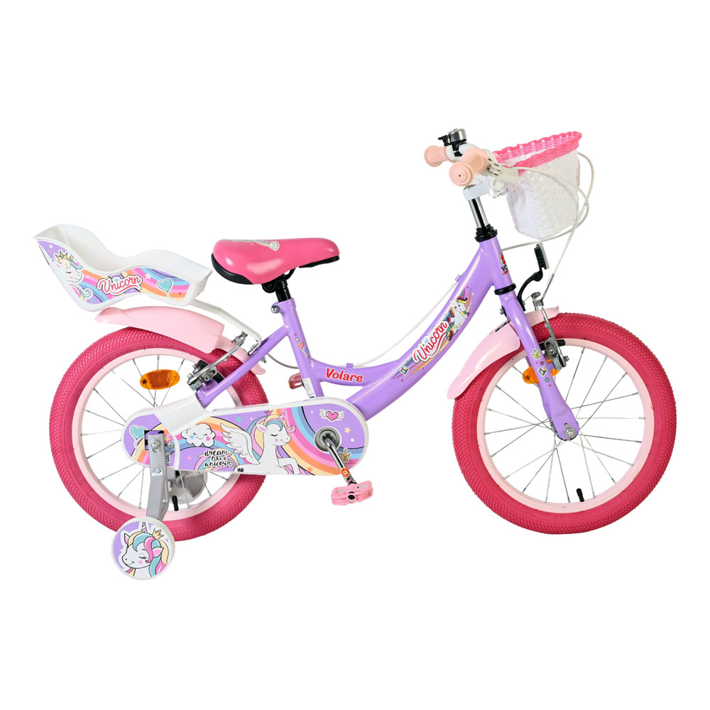 The Volare Unicorn 16-inch children's bike is a true dream bike for kids who love colour, imagination, and cheerful unicorn details. The playful purple look, combined with rainbow accents and a charming design, makes every ride special. The bike is equipped with two hand brakes (no coaster brakes), so children immediately learn to brake like they would on a full-sized bike. The fully enclosed chain guard provides extra protection while cycling. Thanks to the height-adjustable saddle and handlebars, the bike easily grows with your child. With the removable training wheels, children can learn to ride safely and confidently. The pink tires give the bike a striking and stylish look. There's a handy basket on the front and a doll seat on the back, perfect for carrying toys or a favourite doll. For visibility, the bike is equipped with reflectors on the front, back, and wheels, and of course, a bell completes the look. The Volare Unicorn 16 inch is a magical and safe children's bike that turns every ride into a fun adventure.