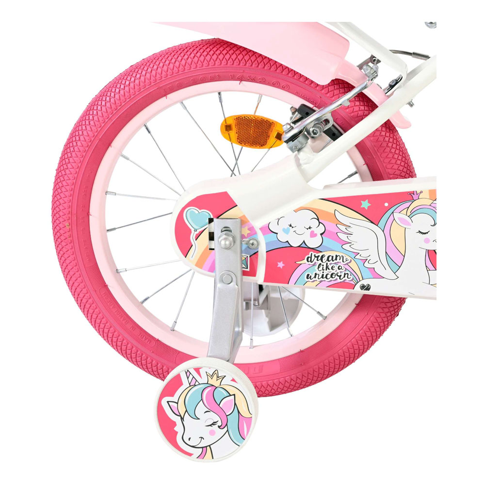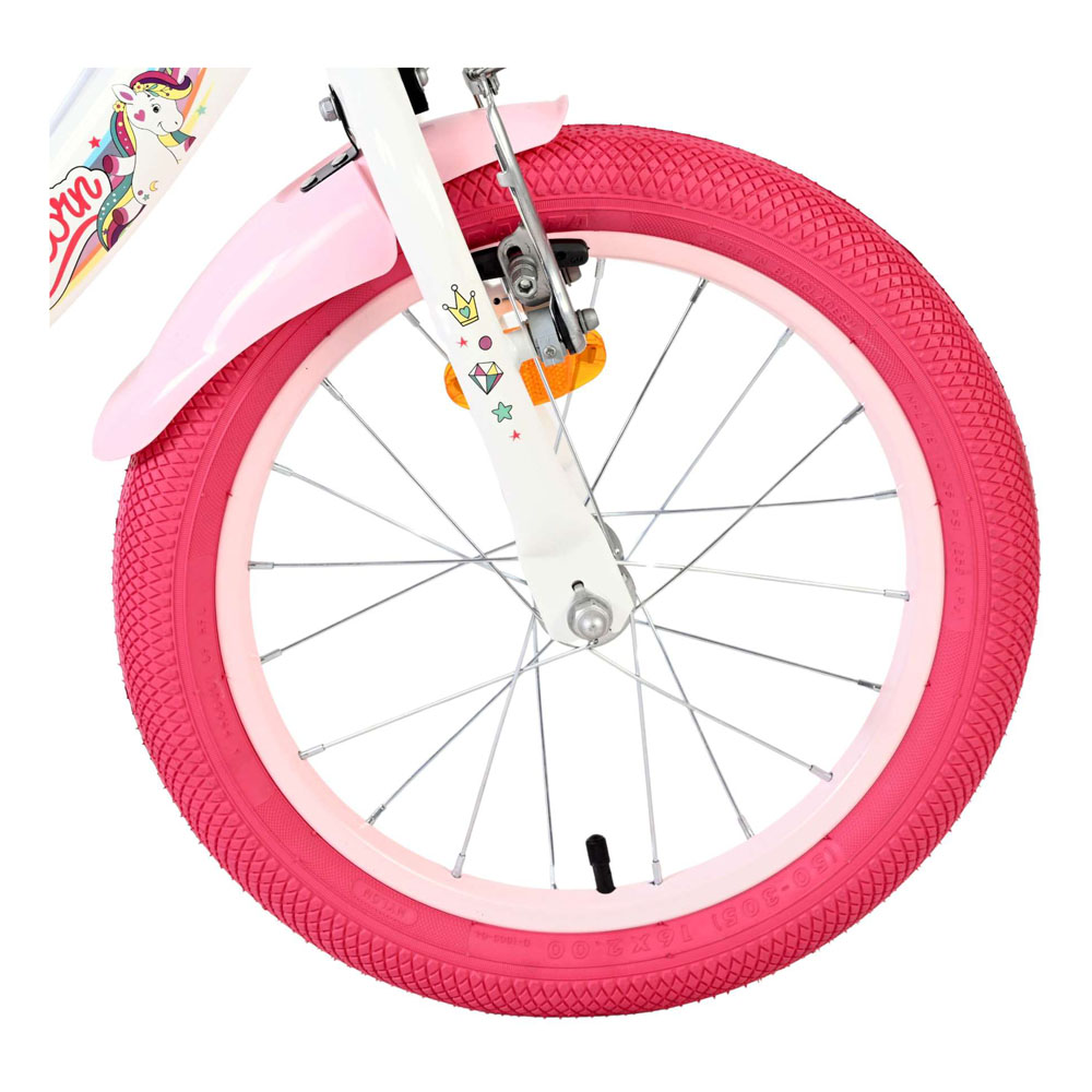 The Volare Unicorn 16-inch children's bike is a true dream bike for kids who love colour, imagination, and cheerful unicorn details. Its playful white look, combined with rainbow accents and a charming design, makes every ride special. The bike is equipped with two hand brakes (no coaster brakes), so children immediately learn to brake like they would on a full-sized bike. The fully enclosed chain guard provides extra protection while cycling. Thanks to the height-adjustable saddle and handlebars, the bike easily grows with your child. With the removable training wheels, children can learn to ride safely and confidently. The pink tires give the bike a striking and stylish look. There's a handy basket on the front and a doll seat on the back, perfect for carrying toys or a favourite doll. For visibility, the bike is equipped with reflectors on the front, back, and wheels, and of course, a bell completes the look. The Volare Unicorn 16 inch is a magical and safe children's bike that turns every ride into a fun adventure.
