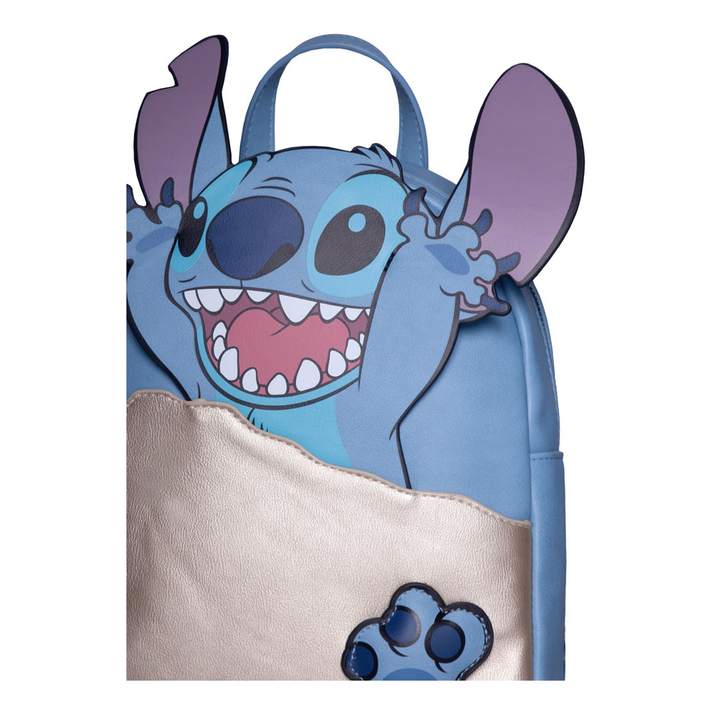 The backpack includes a 3D applique front graphic art of Stitch's face, complete with three ears and premium embroidered details, bringing the mischievous character to life in vibrant detail. Adding to its charm, an open front pocket in a unique shape with shimmer material provides a playful touch, perfect for storing small essentials. For an extra dose of fun, the backpack includes a 3D applique of Stitch's feet, adding another delightful detail to the design.