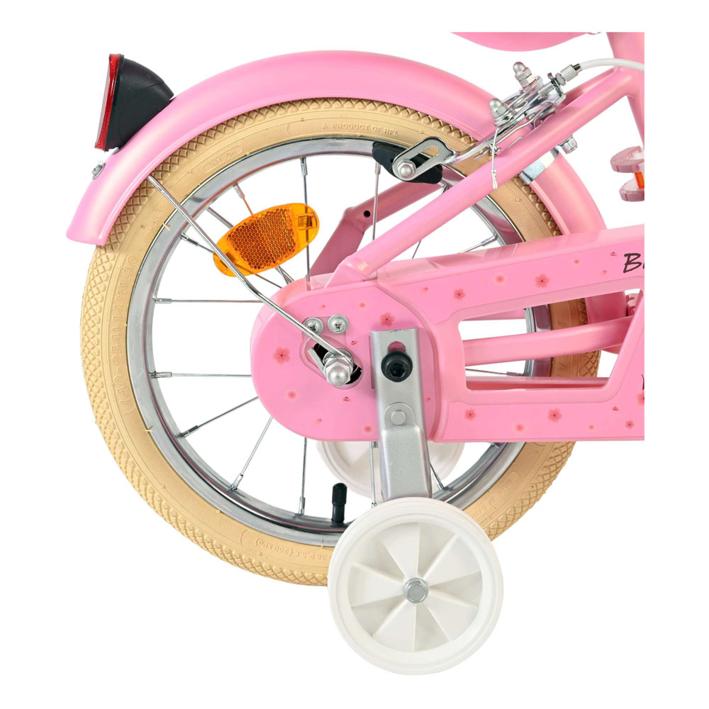 Learning to ride a bike is fun for every child with the Volare Blossom 14-inch children's bike! Safety is paramount! That's why this cool bike doesn't have a coaster brake, but two hand brakes, removable training wheels, and a closed chain guard. It has reflectors on the front, back, and wheels. Comfort has also been considered. The beautiful pink Volare bike features a comfortable, soft saddle, a doll seat, cheerful handlebar decorations, and a handy wicker basket. To ensure you can enjoy the bike for as long as possible, the saddle and handlebars are height-adjustable. All mounting hardware needed to assemble the bike is included! In short: a top quality bicycle for a competitive price!