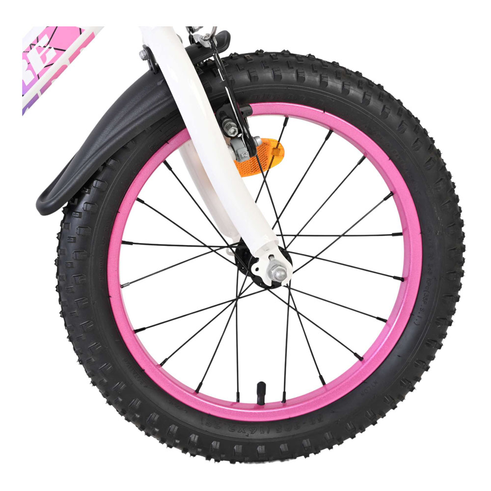 The Volare Lily 16-inch children's bike is a beautiful bike for young girls who love to ride in style. With its fresh white colour, purple and pink accents, and striking pink rims and handlebars, this bike is a real eye-catcher. The bike is equipped with two hand brakes (no coaster brakes), ensuring safe and controlled braking at all times. The enclosed chain guard protects little fingers and keeps the chain clean. Thanks to the reflectors in the wheels, both front and rear, your child is clearly visible on the road. The removable training wheels help children learn to ride a bike step by step, and when they're ready to ride independently, the training wheels can easily be removed. The saddle and handlebars are height-adjustable, so the bike grows with your child. It also features a bell, so everyone knows a proud little cyclist is approaching. The Volare Lily 16-inch children's bike combines safety, comfort, and a beautiful design perfect for every ride full of fun and colour.