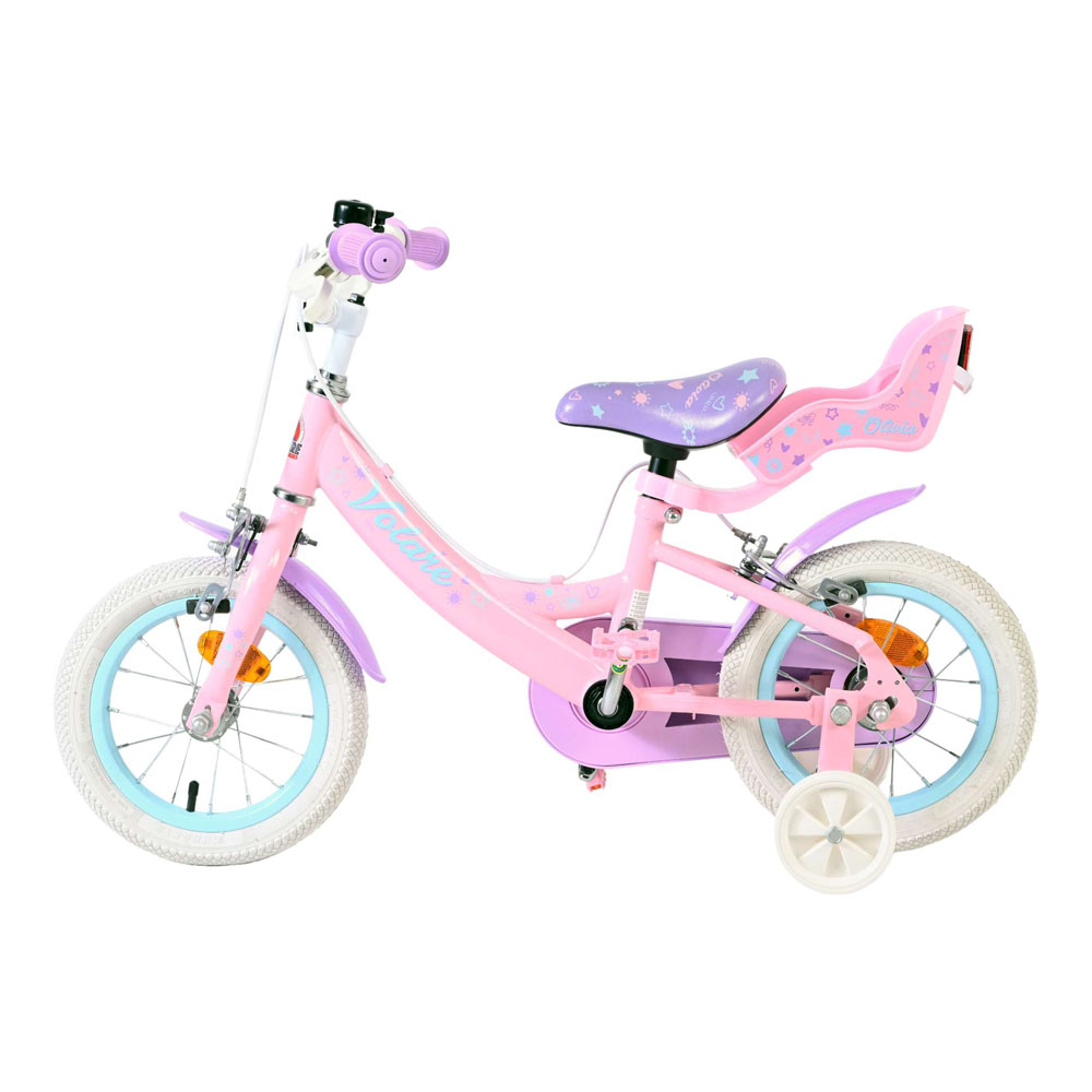 The Volare Olivia 12-inch children's bike is a cute and stylish bike for young girls exploring their first cycling experiences. With its soft pink colour, purple handlebars, saddle, and mudguards, this bike is a real eye-catcher. The bike is equipped with two hand brakes (no coaster brakes), ensuring safe and controlled braking at all times. The enclosed chain guard protects little fingers and keeps the chain clean. Thanks to the reflectors in the wheels, both front and rear, your child is clearly visible on the road. The removable training wheels help children learn to ride a bike step by step, and when they're ready to ride independently, the training wheels are easily removed. A fun doll seat sits on the back of the bike, so their favourite doll can always come along on their adventures. The saddle and handlebars are height-adjustable, so the bike grows with your child. It also features a bell, so everyone knows a proud little cyclist is approaching. The Volare Olivia 12-inch children's bike combines safety, comfort, and a sweet design perfect for every fun-filled and imaginative ride.