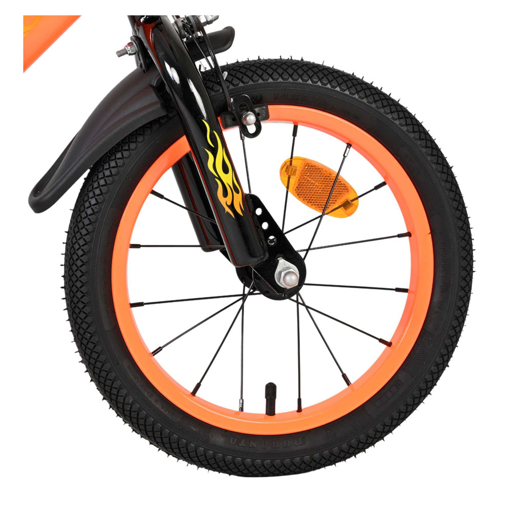 The Volare Strike 14-inch children's bike is a cool bike for young racers ready for their first big adventures on two wheels. With its sporty black and orange design and robust appearance, this bike is a real eye-catcher. The bike is equipped with two hand brakes (no coaster brakes), ensuring safe and controlled braking at all times. The enclosed chain guard protects little fingers and keeps the chain clean. Thanks to the reflectors in the wheels, both front and rear, your child is clearly visible on the road. The removable training wheels help children learn to ride a bike step by step, and when they're ready to ride independently, the training wheels can easily be removed. The saddle and handlebars are height-adjustable, so the bike grows with your child. It also features a bell so everyone knows a real rider is approaching. The Volare Strike 14-inch children's bike combines safety, quality, and a cool design perfect for little speed demons who want to cycle with confidence.
