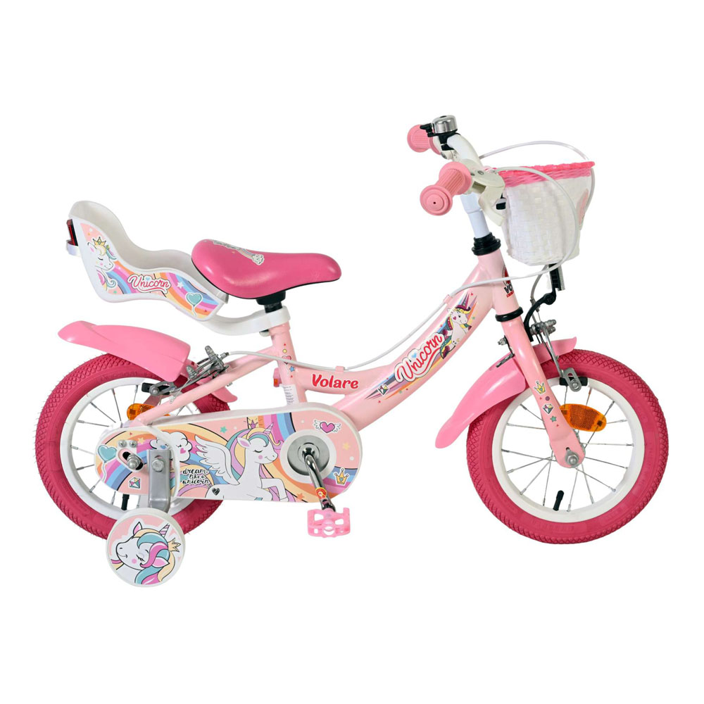 The Volare Unicorn 12-inch is the perfect bike for little ones who love colour and fantasy. This cheerful girls' bike comes in a beautiful pink and is decorated with colourful unicorn details that make every ride special. The bike has only two hand brakes (no back-pedal brakes), so children immediately learn to brake like they would on a real big bike. With its pink tires, handy basket on the front, and doll seat on the back, this bike is ideal for daily playtime. The saddle and handlebars are height-adjustable, allowing the bike to grow with your child. The removable training wheels provide extra support during the first few meters. Thanks to the reflectors on the front, back, and wheels, your child is clearly visible. A bell completes the cheerful look. The Volare Unicorn 12 inch: a safe, sturdy and magical children's bike that will make every child happy.