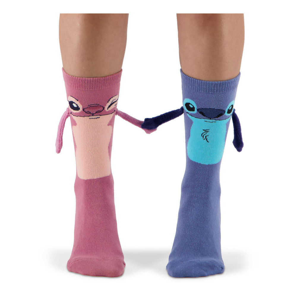 These novelty socks deliver visual storytelling magic: designed in a soft cotton blend knit, each pair includes bold character knits of Stitch and Angel with 3D arms - and built-in magnets so the socks can literally hold hands.