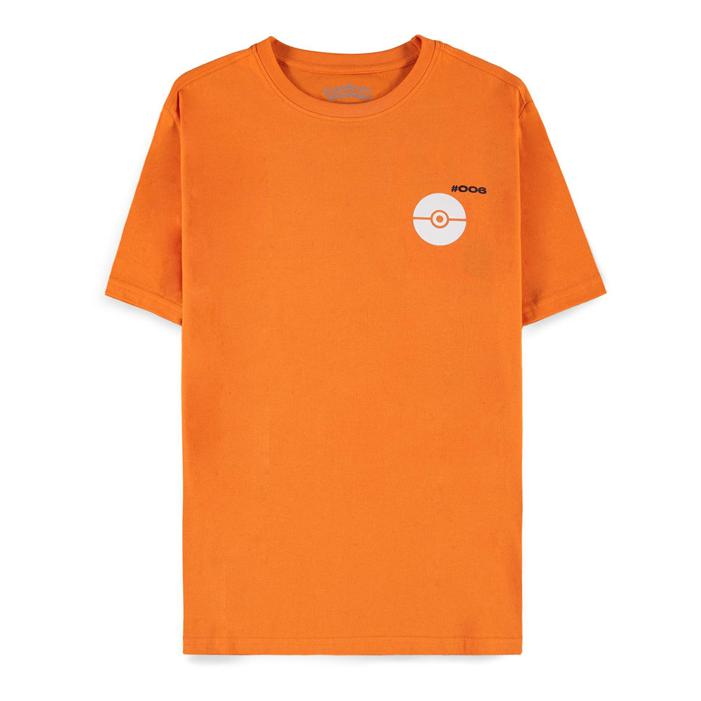 Turn the temperature up with this unique orange cotton t-shirt featuring cool graphic elements of the legendary Flame Pokemon. The front chest graphic of the famous Pokeball is HD printed with the number #006 above it. On the back, you'll find a large graphic art of Charizard rising through the flames along with other familiar character elements, all in a soft feel screen print.